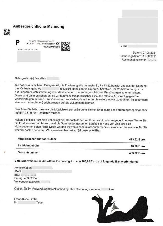 In einer Mahnung verlangt der vermeintliche Anbieter der Dienstleistung stolze 483 €. Es wird eine Zahlungsfrist gesetzt und mit weiteren Konsequenzen gedroht.