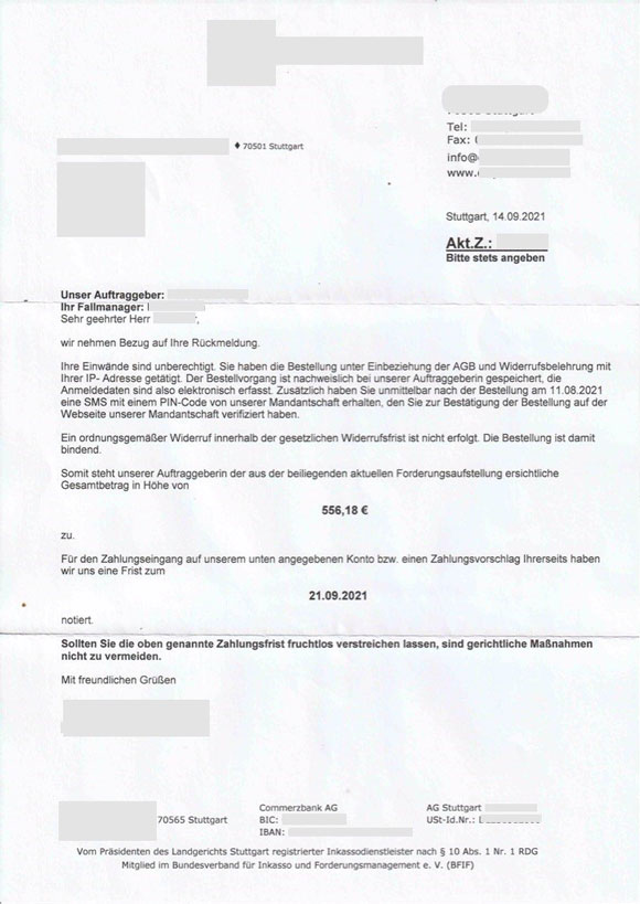 In einem anderen Schreiben geht das Inkassobüro zwar auf den Widerspruch ein. Es wird jedoch argumentiert, dass dem Verbraucher der Vertragsabschluss mittels IP-Adresse eindeutig zugeordnet werden könne.