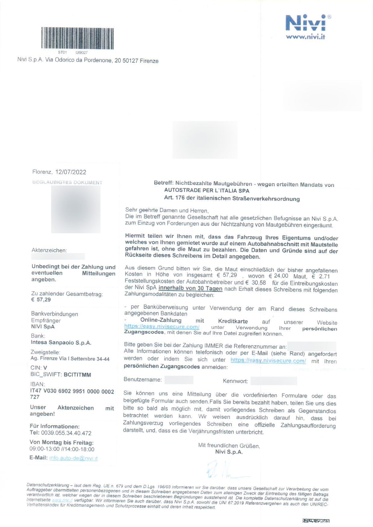 Anyone travelling by car in Italy may receive a letter from the Italian company Nivi SpA on their return. The reason is usually an unpaid toll. Many travellers are unsure and wonder whether the accusation is valid and whether they have to pay.