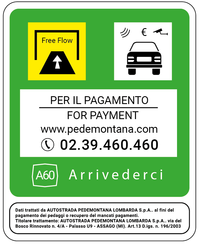 The so-called “free-flow” toll system applies to the A36 (Pedemontana), A59 (Como) and A60 (Varese) motorways near Milan.