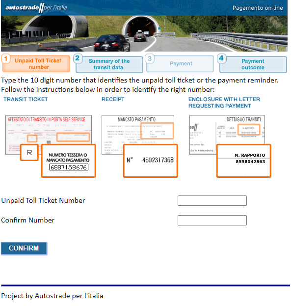 If you have received a receipt (‘Mancato Pagamento’) and the amount of the toll is correct, you can pay it online on the website How to pay – Autostrade per l’Italia