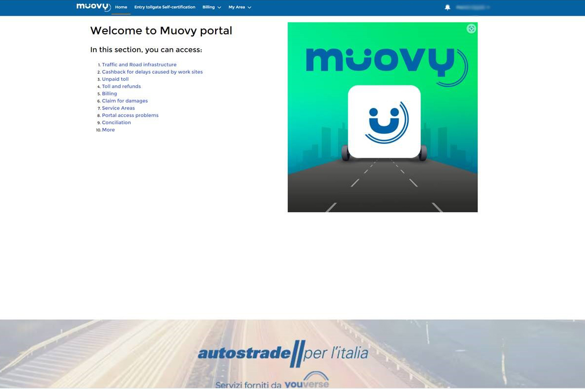 Screenshot of the Italian toll portal Muovy with instructions in English on how to register.